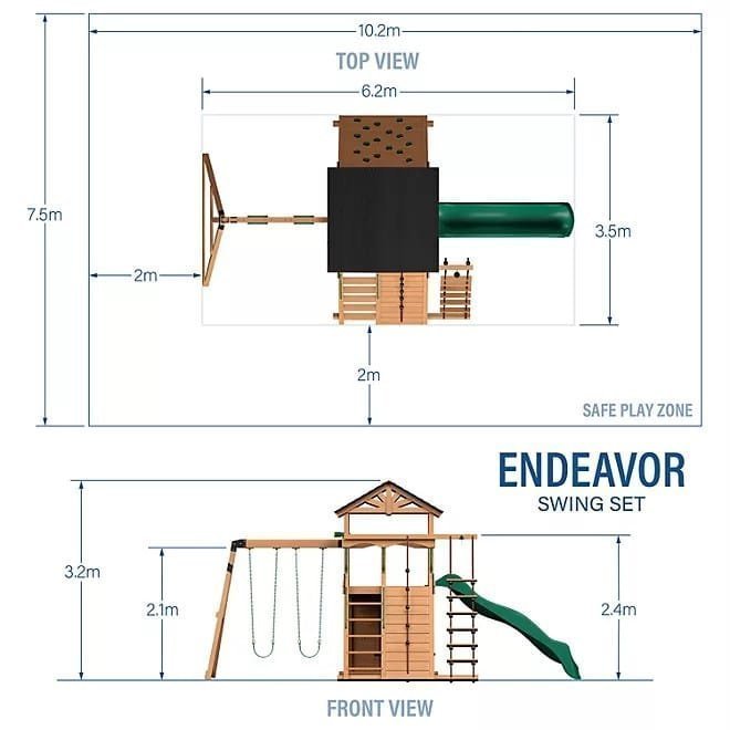 - Swing set with 4’11” x 5’9″ tree house-style covered deck