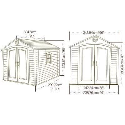 Exterior Dimensions 9 ft. 11.7 in. L x 8 ft. W x 7 ft. 11 in. H (3,04 m x 2,44 m x 2,41 m) Interior Headroom (truss to floor) 6 ft. 8.4 in. (2,03 m) Shed Wind Rating w/out Extreme Weather Kit 65 mi/hr Eave Depth 1.89 in. (4,8 mc) Interior Dimensions 9 ft. 6.3 in. L x 7 ft. 6.3 in. W x 5 ft. 10 in. – 7 ft. 10 in. H (2,90 m x 2,29 m x 1,81 m – 2,38 m) Footprint 9 ft. 10.2 in. L x 7 ft. 9.6 in. W (3,00 m x 2,37 m) Exterior Roof Dimensions 9 ft. 11.7 in. L x 8 ft. W (3,04 m x 2,44 m) Roof Pitch 6:12 Tool Corral Compatible Yes Cubic Feet 426.8 ft³ (12,08 m³) Nominal Dimensions 8 ft. x 10 ft. (2,43 m x 3,04 m) Max Roof Load 23 psf Fascia Height 1.25 in. (3,1 cm) Shed Wind Rating w/ Extreme Weather Kit 20 psf* Square Feet 71.7 ft.² (6,66 m²) Windows One (1) 16.5 in. W x 16.5 in. H Polycarbonate Window – Opens Half-Way Door Opening Dimensions 75.7 in. H 56.4 in. W (192,2 cm x 142,8 cm)